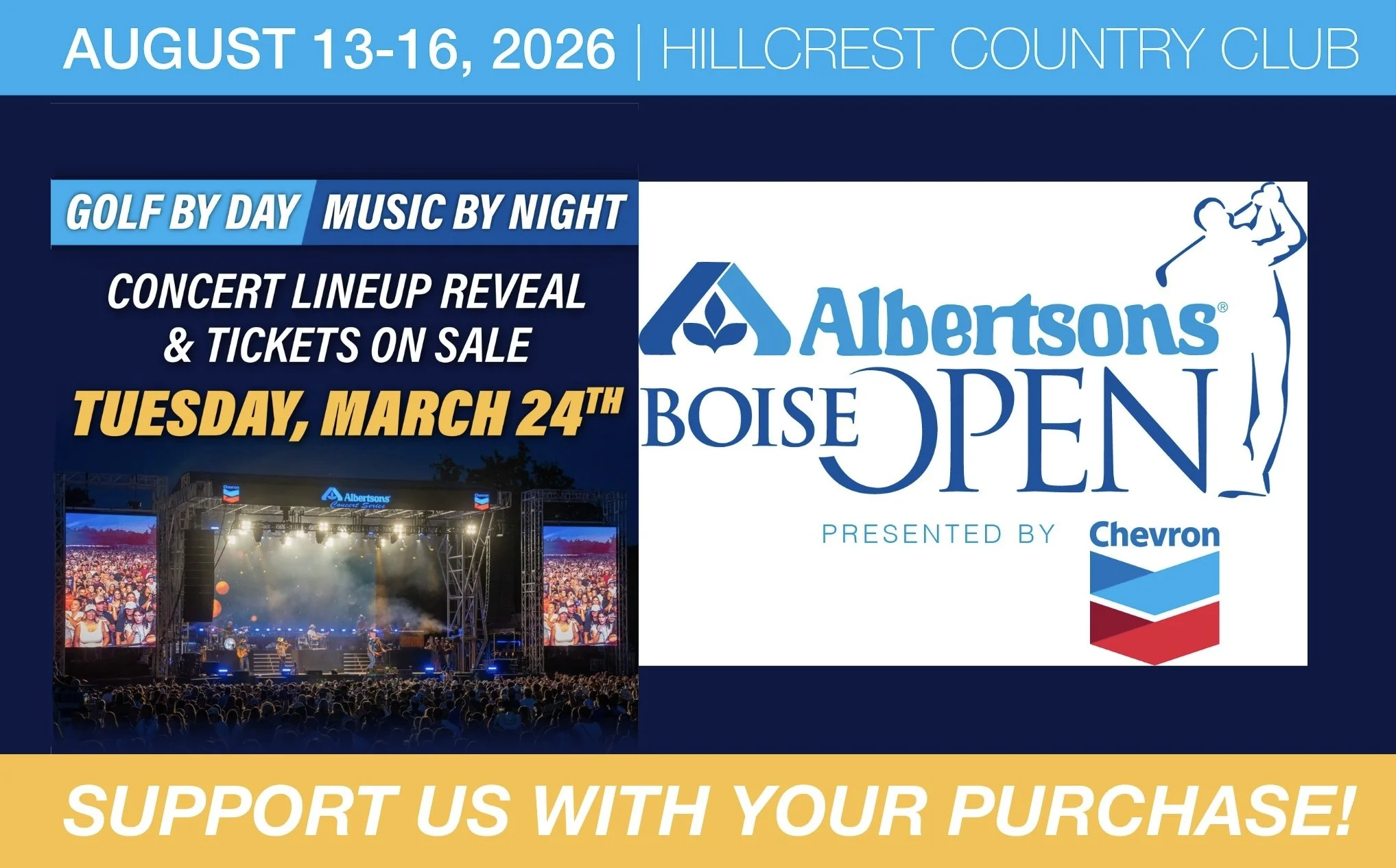 We are thrilled to announce that Idaho2Fly has been selected for the first time to participate as a charity partner in the 2026 Albertsons Boise Open Presented by Chevron. This spectacular summer event returns to Hillcrest Country Club on August 13-16, 2026 and features four days of world-class golf, and three nights of amazing live concerts. This golf tournament hosts many of the best golfers in the world and each night on the 18th fairway immediately after the golf concludes the concerts begin! All tickets include admission to the golf tournament by day and concerts at night. But that’s not all — The 37th Annual Albertsons Boise Open, operated through the Mondelez Tickets Support Program, will donate 100% of ticket sales to selected local charities. Ticket buyers choose which charity their tickets will support!